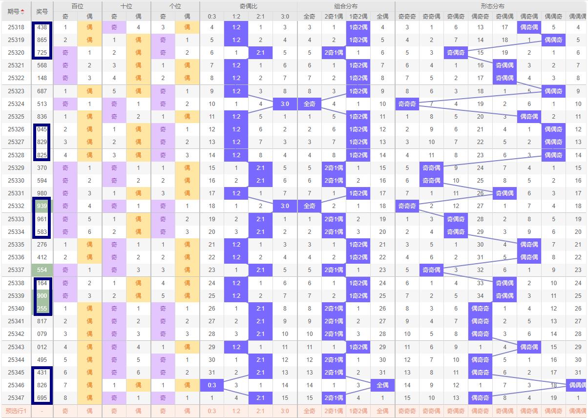 奇偶比例分析 347期的开奖号码为695奇偶比为2:1,奇数占据主导地位。在奇偶比例的分析中,同样注重平衡原则。考虑到近期奇偶比的波动,可以预判348期的奇偶比例将继续保持平衡,即可能为1:2。这样的预判不仅符合历史数据的统计规律,也体现了奇偶比例在短期内的调整趋势。