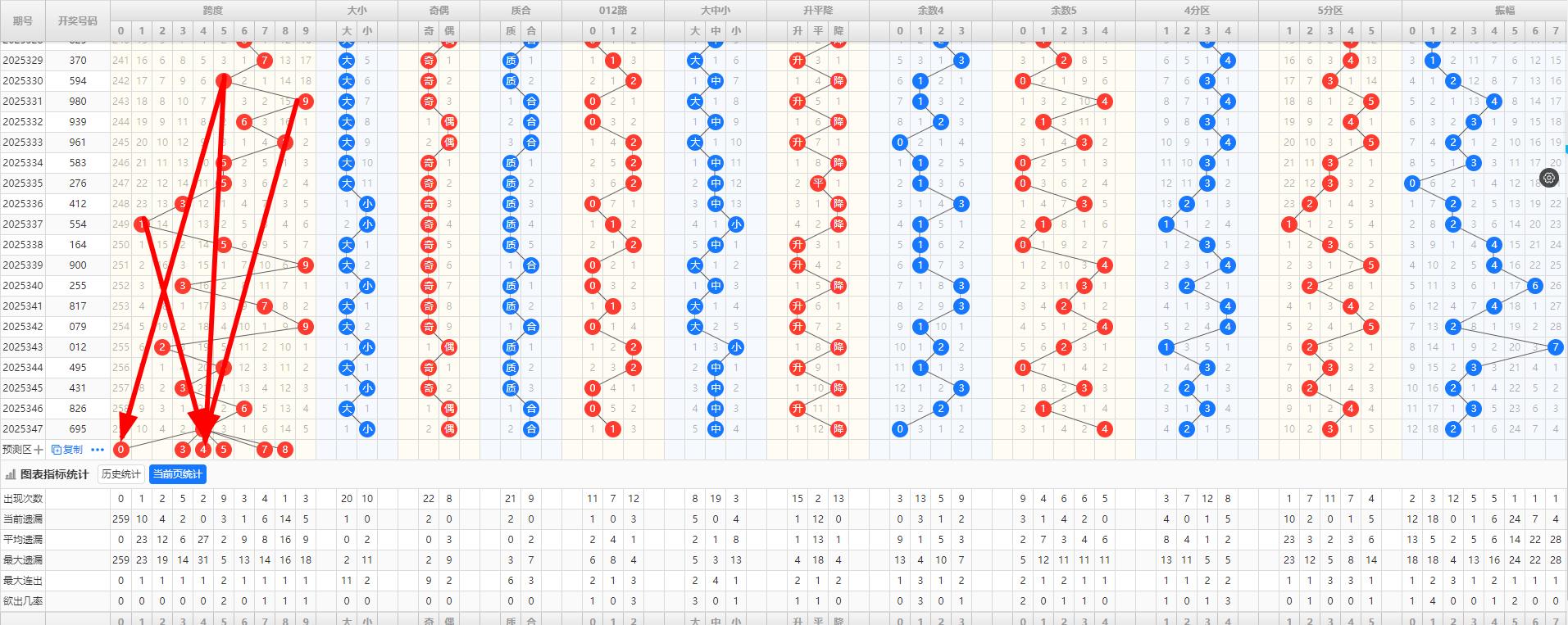 和值预判分析: 347期的开奖号码为695.和值为20,这是一个较大的和值。在和值走势的分析中,注重和值的波动性和稳定性。考虑到近期和值的波动范围,我们可以预判348期的和值将在3到15之间波动。这样的预判不仅符合和值的波动性规律,也体现了和值的稳定性原则。