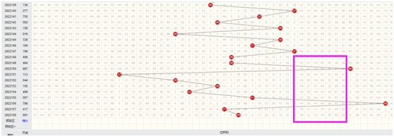 上图就是近期排三位积和的走势情况,上期位积和是29,我们可以看到近期排三位积和出号码范围都是20-50之间,其实通过历史数据来看位积和超过45的其实并不多,那么上图里很明显看到了有一片空白区域,是不是一马平川了,这个就是位积和38、39、40、41、42、43、44的空缺,因此今天第一个思路就是控制在位积和上,关注位积和为这个范围,所以就决定了,今天号码应该不会小。