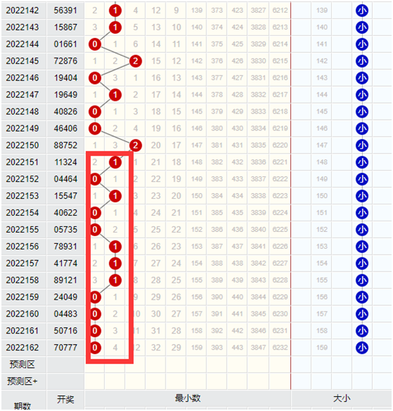 2022151期排列5开奖是11324, 162期开奖是70777,我们通过近12期的排列5开奖数据就知道,这12期里排列5里最小号码就是0和1,这也就是说明排列5的最小数字0和1应该完成了它的使命,应该关注最小数字是大于0和1的,即排除胆码0和1。这个时候大家注意了,既然分析排列5的时候可以排除胆码0和1,是不是说明排列3里也必须排除胆码0和1呢?