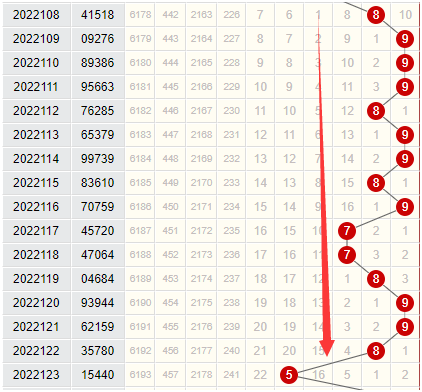 既然分析了最小数,我们就反过来看看近期排列5最大数字的表现,比如从2022108期开奖排列5开奖41518,一直到2022122期排列5开奖35780,这段时间排列5的最大数字就是7、8、9,应该是连续15期,如果我们回到123期我们一定会去判断排列5最大数字不能在开出7、8、9了,按照这个思路也就是说可以排除胆码7、8、9,既然排列5可以排除这些废号,排列3一样可以排除,123期排列5开奖15440,排列3开奖154,最大数字是5,排除这些废号成功,这个就是最大数字在排列3以及排列5里的关系。