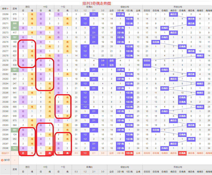 上一期的奇偶比为2:1,两奇的号码组合,从近五期的奇偶数出现情况看,奇数出8次,偶数出现7次,奇数偶数号码出现较平均,本期要侧重两偶的号码组合,侧重奇偶偶或奇奇偶的号码组合,根据奇偶组合形态可做五码定位13579/02468/02468或13579/13579/02468