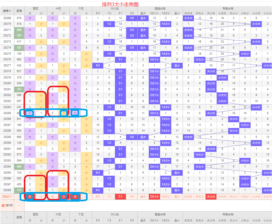 上一期大小比为0:3,全小的号码组合,近五期大号出4次,小号出11次,大号码出现较少,上一期是两小的号码组合,本期侧重两大的号码组合,百位侧重大号码,十位侧重小号码,个位侧重大号码,侧重大小大或者大大小的号码组合,根据大小形态五码定位56789/01234/56789或者56789/56789/01234