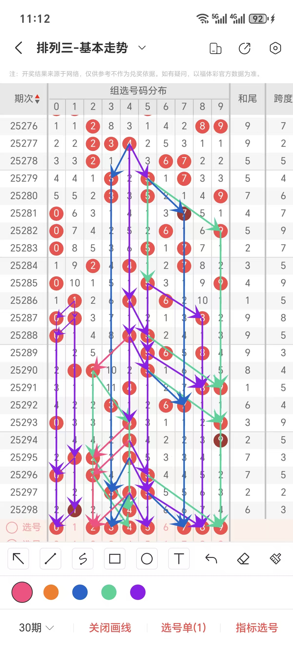 通常情况下在五期之内重复一个跨度的概率较高,近五期重复了5的跨度,近五期跨度为5/3/5/2/3,近期02路的跨度较热,本期要侧重4/5/8跨为主的号码组合。选择好跨度就可以从跨度方面选择相应的双胆码组合,双胆码的选取要根据近期和历史的走势进一步的分析选取。