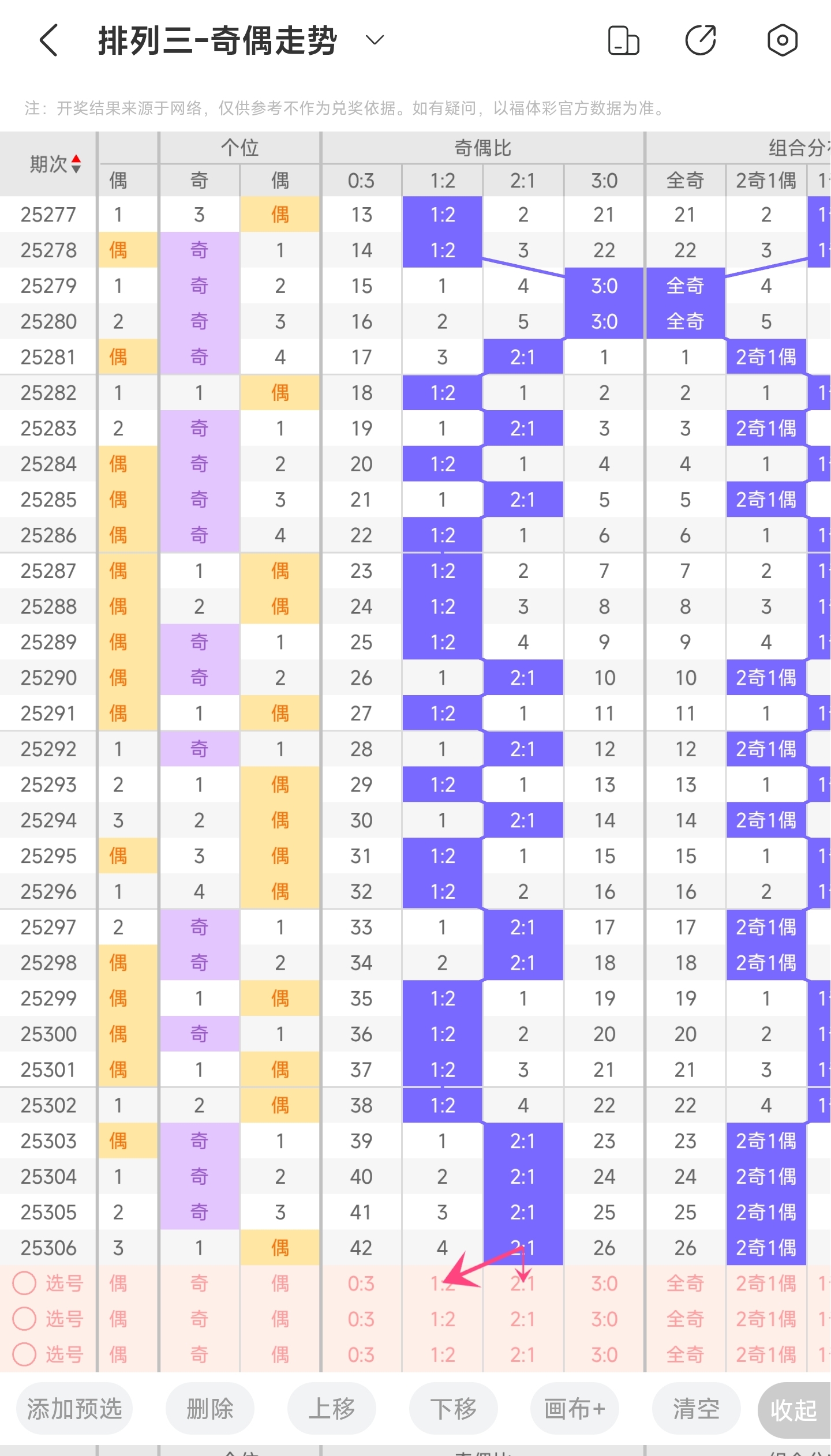 上期开出了2:1的奇偶比。往前一期是2:1奇偶比。通过分析奇偶走势图,近30期内开出1:2奇偶比的次数是16次,开出2:1奇偶比的次数是12次,3:0是2次,0:3是0次。和前一期相比,2:1次数变多,1:2次数变少。通过走势图分析,可以就看到1:2奇偶比最热门,有可能开出,而2:1目前回补的趋势也比较强,也可能开出。所以推测本期可能开2:1奇偶比或者1:2奇偶比,最后是3:0或者0:3奇偶比。