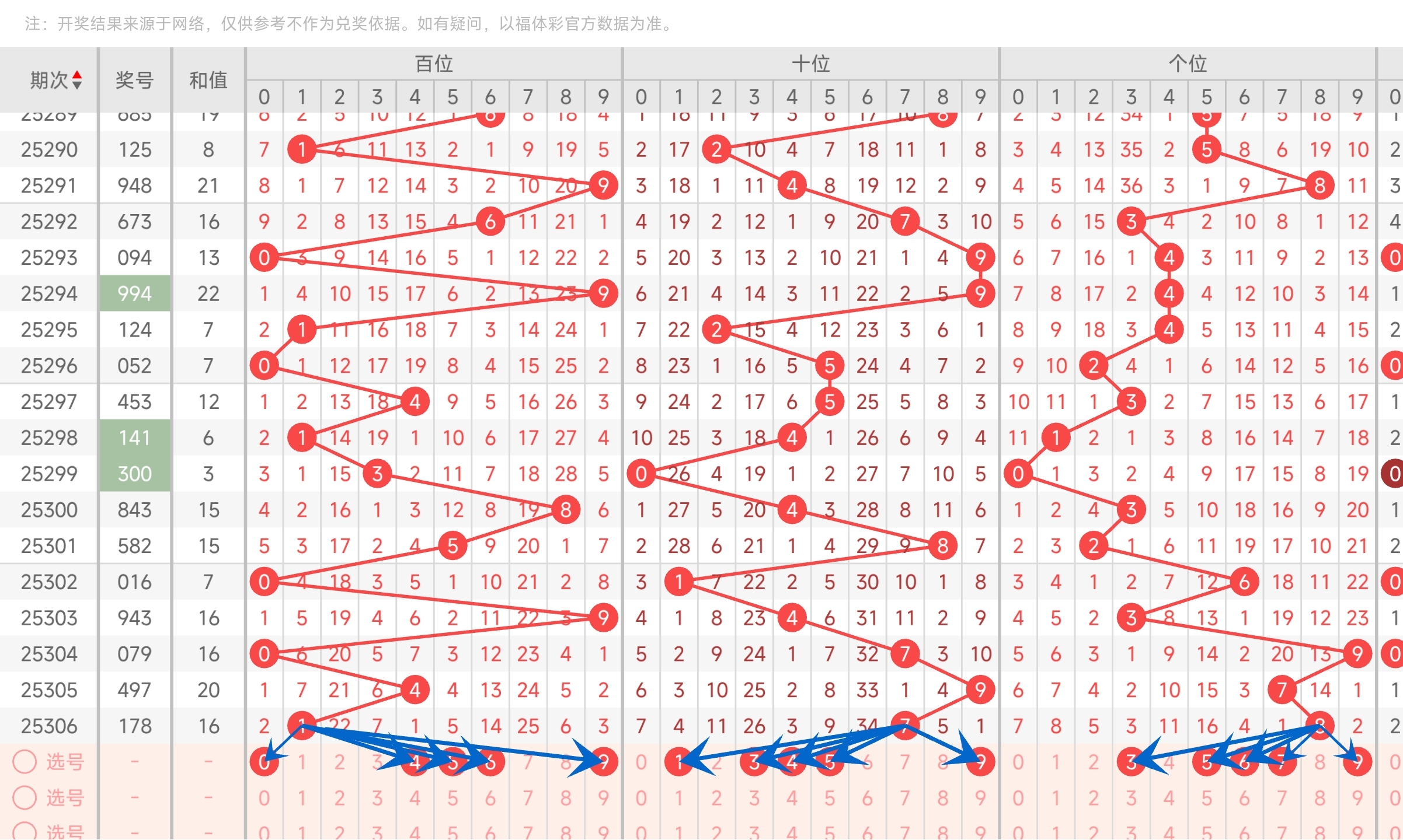 上期和值为16,往前一期和值为20,趋势往左移动,偏移量为4。通过走势图分析,16和值是近30期内开出的中间偏大一点的和值,上升空间和下降空间差不多。所以趋势是可能往左也可能往右。本期看好小和值,因此推测本期趋势是往左的,和值会变小,小概率往右,和值变大。