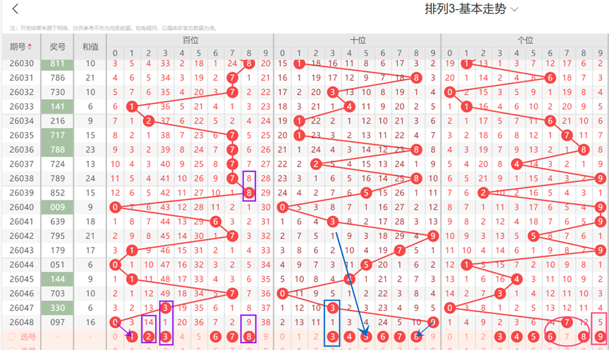上一期百位开出号码为0,为偶数、小数、合数、0路号码:近10期百位459等号码遗漏值高,出号机会少,本期百位大概率不会开出459等号码,因此本期百位选号时可以优先排除459等号码,结合上述走势图看,本期百位看好123678等号码。