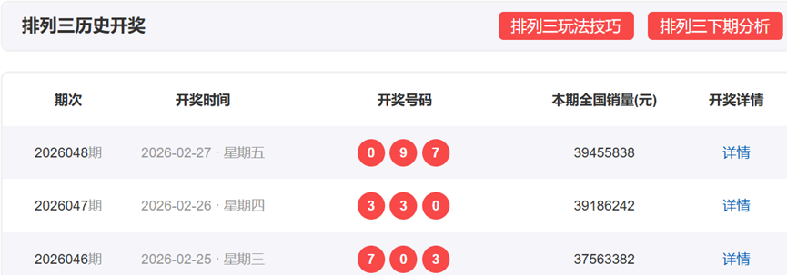 体彩排列3上一期,开奖号码为097,形态为组六,奇偶比为2:1,012路数值表现为001,和值16,和尾6,跨度9。