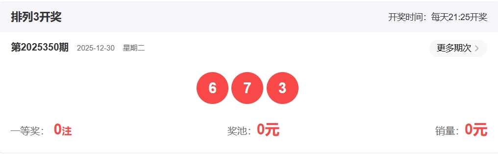 排列三第2025350期开奖回顾:开奖号码:673 形态:组六