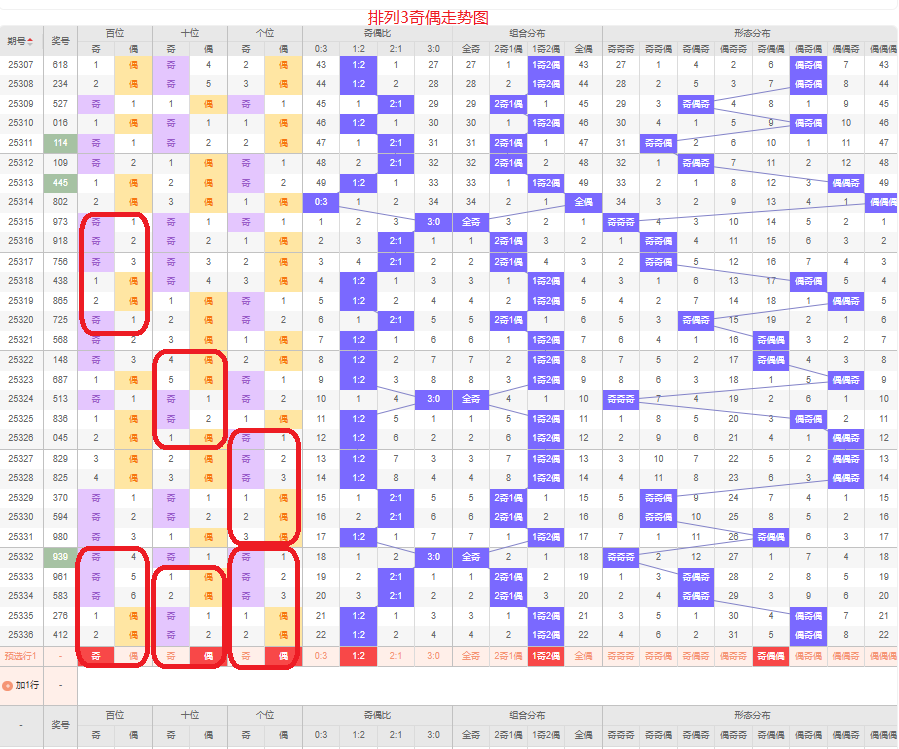 上一期的奇偶比为1:2,两偶的号码组合,从近五期的奇偶数出现情况看,奇数出9次,偶数出现6次,奇数号码出现较多,本期要侧重两偶的号码组合,侧重奇偶偶或偶偶偶的号码组合,根据奇偶组合形态可做五码定位13579/02468/02468或02468/02468/02468