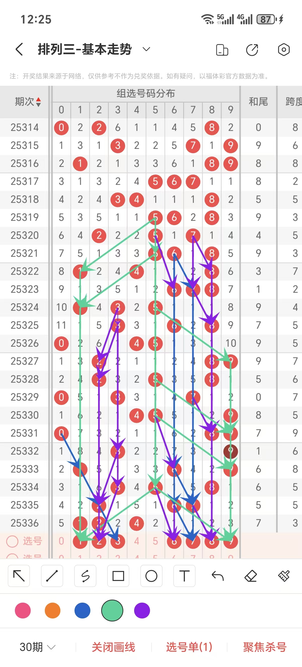 通常情况下在五期之内重复一个跨度的概率较高,近五期重复了5的跨度,近五期跨度为6/8/5/5/3,近期02路的跨度较热,本期要侧重6/7/8跨为主的号码组合。选择好跨度就可以从跨度方面选择相应的双胆码组合,双胆码的选取要根据近期和历史的走势进一步的分析选取。