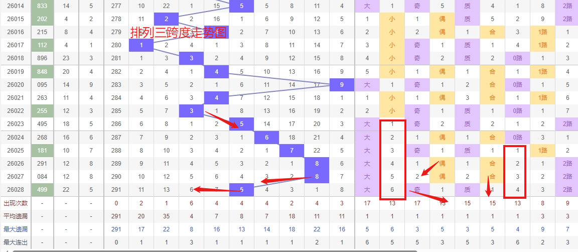 排列三 跨度分析:从上图可以看出近100期的跨度大小比约为48比52,跨度奇偶比约为49比51总体来看还是比较均衡的,但跨度大小之间有点差异。我们再从历史开出5跨后下一期3跨度数据来做参考。最近10期跨度大小比约为5:5期开出小数跨度过多返回大数跨度的概率更高一点。历史开奖近2期出5跨以后的走势为307期开出5跨后下一期走2跨走出3振幅,第316期开出5跨后下一期走3跨走2振幅第324期开出5跨后下一期开出7跨走出2振幅。连续多期小振幅排列三跨度走势观察,近期跨度3的热度非常显著,呈现出高频且连续的出号态势,这种强势状态在短期内大概率会延续,是值得关注的重点方向。而跨度7则恰好相反,已进入明显的低温冷态,遗漏周期不断拉长;从概率平衡与走势规律来看,冷跨通常在沉寂一段时间后会迎来阶段性回补,目前跨度7正逐渐接近这样一个临界点,反弹的预期不断增强。因此,在策略上应坚持“追热防冷”的思路,一方面紧盯跨度3的持续表现,另一方面也需对跨度7可能出现的回补做好提前防范,出5跨度后容易走出2到4个跨度振幅的对称形态,跨度走出2到4个振幅看好的跨度有2367跨,所以第2026029期排列三跨度推荐2367跨。