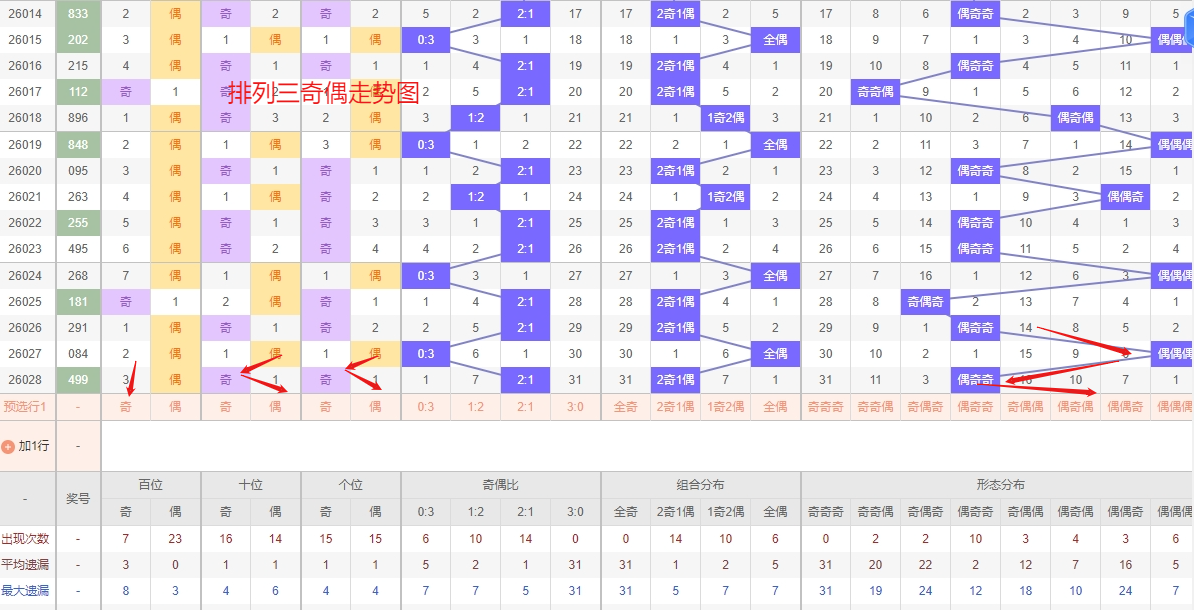排列三 奇偶分析:从上图可以看出排列三100期内百位奇偶比约为45比55,十位奇偶比为49比51,个位奇偶比为53比47,十位的比值比较均衡,但是百位的比值偏差就有点大,历史奇偶形态近2期开出偶奇奇后下一期的走势为,第304期开出偶奇奇后305期开奇奇偶, 第317期开出偶奇奇后第318期开偶偶奇,第327期开出偶奇奇后第328期开奇偶偶,近期排列三的奇偶形态分布来看,“奇奇偶”组合已持续遗漏较长时间,其作为冷号形态,理论上已逐步接近回补临界点。历史数据表明,此类冷态在经历一段深度遗漏后,往往会出现技术性反弹,因此近期应重点关注其可能出现的回补信号,做好追踪准备。与此同时,“偶偶奇”作为温号形态,近期出现频率有所上升,走势呈现逐步转热的趋势,这种温号转热阶段常伴随连续或高频出现,需要重点防范其短期内进一步走强。总体来看,当前阶段可采取冷热兼顾的策略,在关注“奇奇偶”冷号回补机会的同时,也要警惕“偶偶奇”温号转热对整体奇偶格局的带动作用,所以排列三2026029期奇偶形态推奇奇偶与偶偶奇。