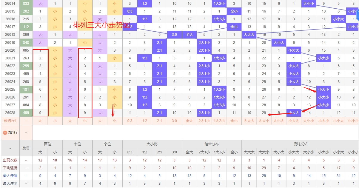 排列三 大小形态分析:从大小走势图上可以看出排列三100期内百位大小比约为47比53,十位大小比约为46:54,个位大小比约为51比49,除了个位奇数比偶数多,十位和百位偶数比奇数多。历史数据近2期开出小大大下一期的走势为,第307期开出小大大第308期开大小大。第315期开出小大大后第316期开大大小,第324期开出小大大后325期开小小大。近期排列三大小走势来看,“大小大”组合呈现明显热态,出现频率较高且走势集中,短期内仍具备连续开出的动能,值得重点关注其延续性。另一方面,“大大小”组合已持续遗漏较长时间,作为当前冷态,其理论上已逐步接近回补临界点,在热号持续走强阶段,冷号往往也需防范其突然反弹。综合而言,在追踪“大小大”热号连下趋势的同时,也需对“大大小”的冷态回补保持警惕,所以排列三第2026029期大小形态推荐大小大防大大小。