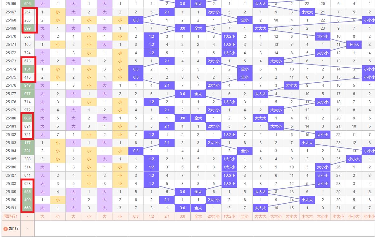 大小走势分析 - 大小比:上期开奖号码呈现大大大形态,即第一位大、第二位大、第三位大。综合近期大小号的波动趋势,建议本期重点关注大小比为1:2的组合,即预测两位小号搭配一位大号。