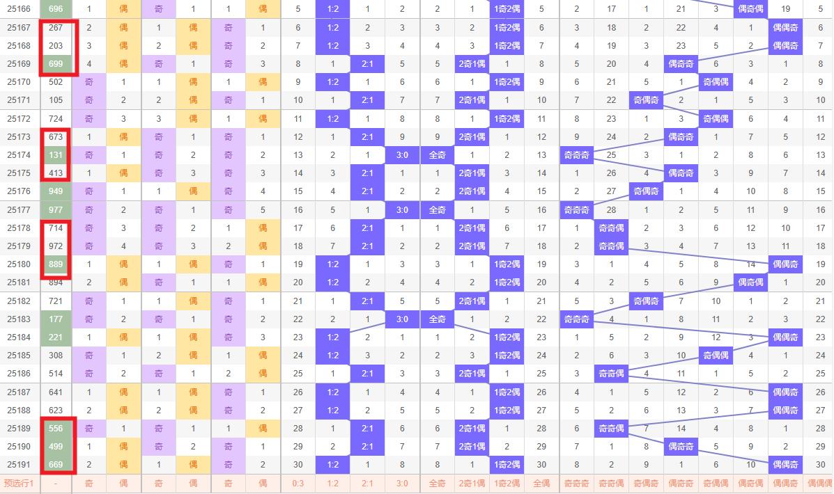 奇偶比例分析 - 奇偶比:上期号码669为偶偶奇形态,奇偶比例为1:2。结合历史数据与近期走势特征,本期可倾向于奇偶比为2:1的组合,即预测两位奇数搭配一位偶数。