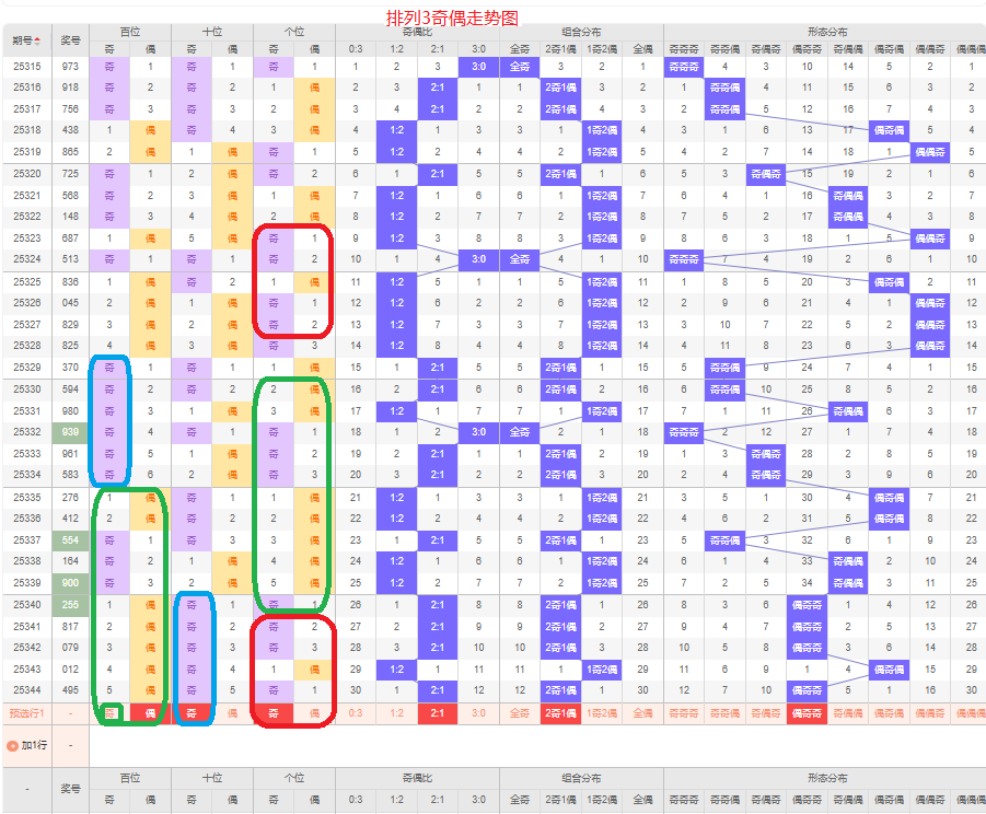 上一期的奇偶比为2:1,两奇的号码组合,从近五期的奇偶数出现情况看,奇数出9次,偶数出现6次,奇数号码出现较多,本期要侧重两奇的号码组合,侧重偶奇奇或偶偶奇的号码组合,根据奇偶组合形态可做五码定位02468/13579/13579或13579/13579/13579