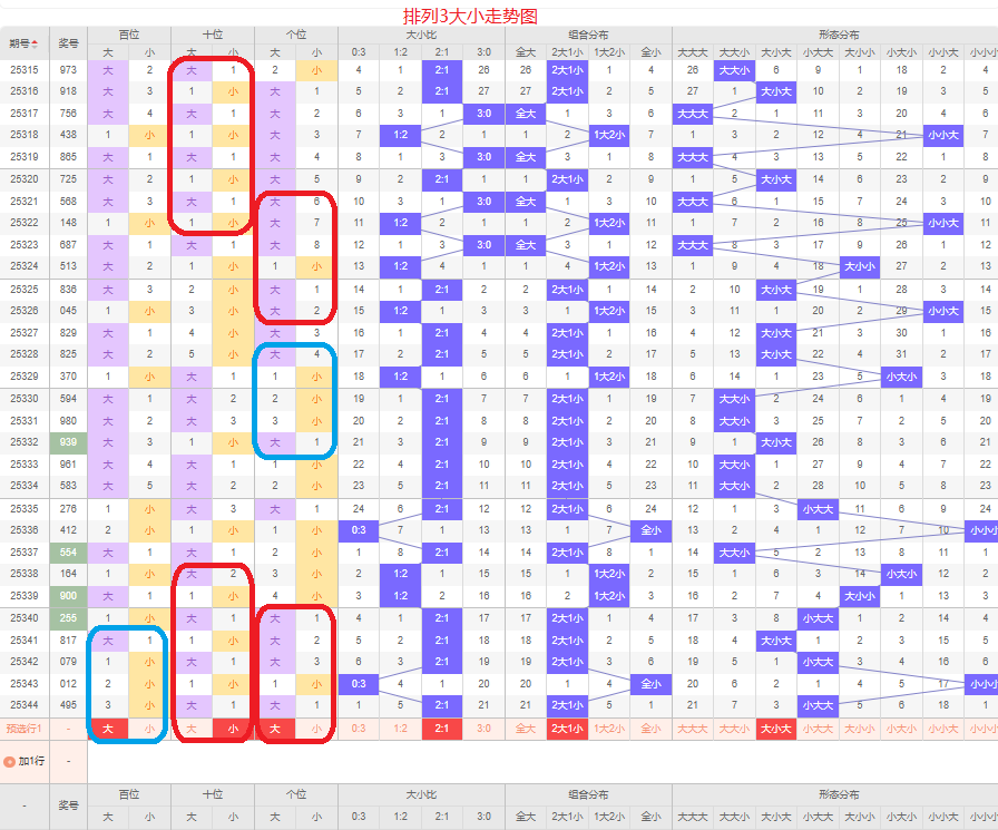 上一期大小比为2:1,两大的号码组合,近五期大号出8次,小号出7次,大小号码出现较平均,上一期是两大的号码组合,本期侧重两大的号码组合,百位侧重大号码,十位侧重小号码,个位侧重大号码,侧重大小大或者大大小的号码组合,根据大小形态五码定位56789/01234/56789或者56789/56789/01234