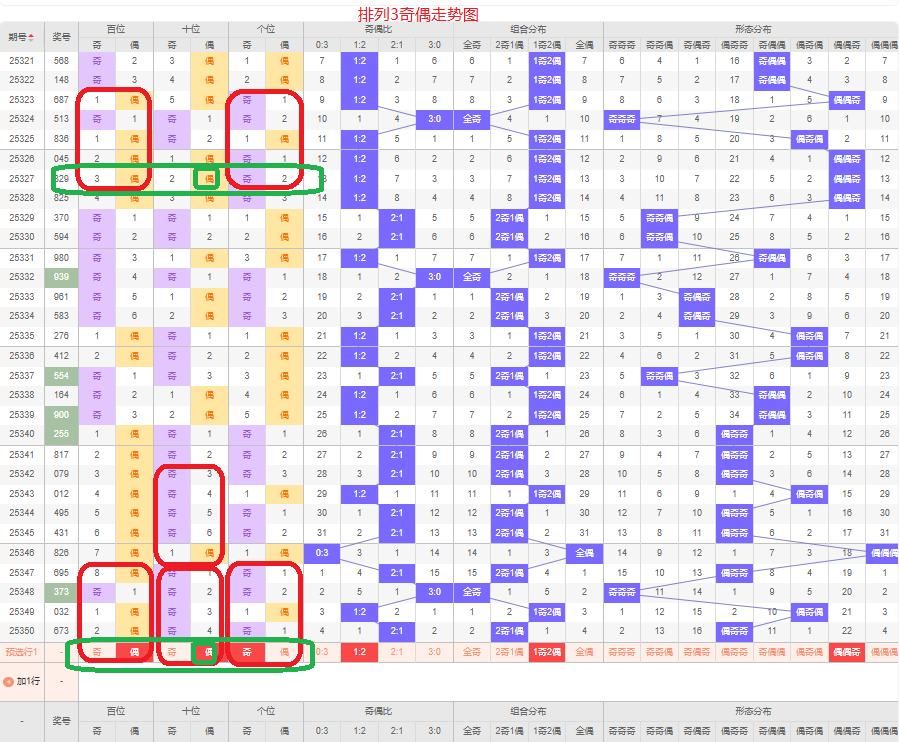 上一期的奇偶比为2:1,两奇的号码组合,从近五期的奇偶数出现情况看,奇数出8次,偶数出现7次,奇数偶数号码出现较平均,本期要侧重两偶的号码组合,侧重偶偶奇或奇偶奇的号码组合,根据奇偶组合形态可做五码定位02468/02468/13579或13579/02468/13579
