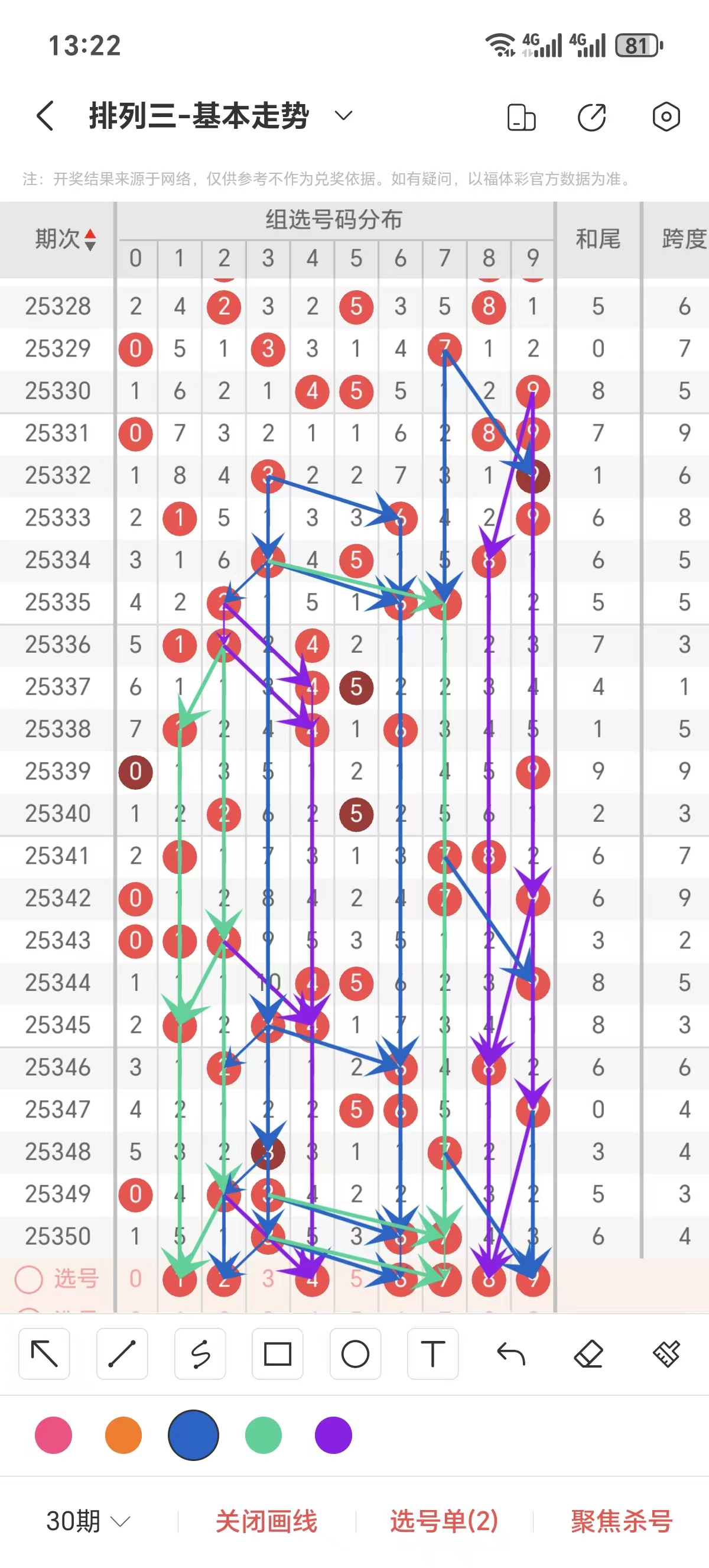 通常情况下在五期之内重复一个跨度的概率较高,近五期重复了4的跨度,近五期跨度为6/4/4/3/4,近期01路的跨度较热,本期要侧重4/5/7跨为主的号码组合。选择好跨度就可以从跨度方面选择相应的双胆码组合,双胆码的选取要根据近期和历史的走势进一步的分析选取。