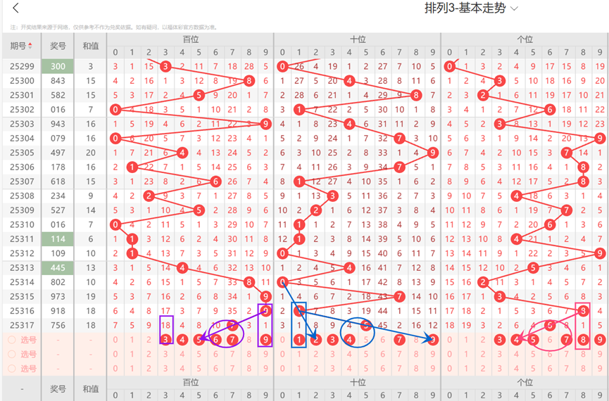 上一期百位开出号码为7,为奇数、大数、质数、1路号码:近10期百位较少开出012等号码,本期百位大概率仍然不会开出012等号码,因此本期百位选号时应该考虑012以外的号码,结合上述走势图看,本期百位看好345679等号码。