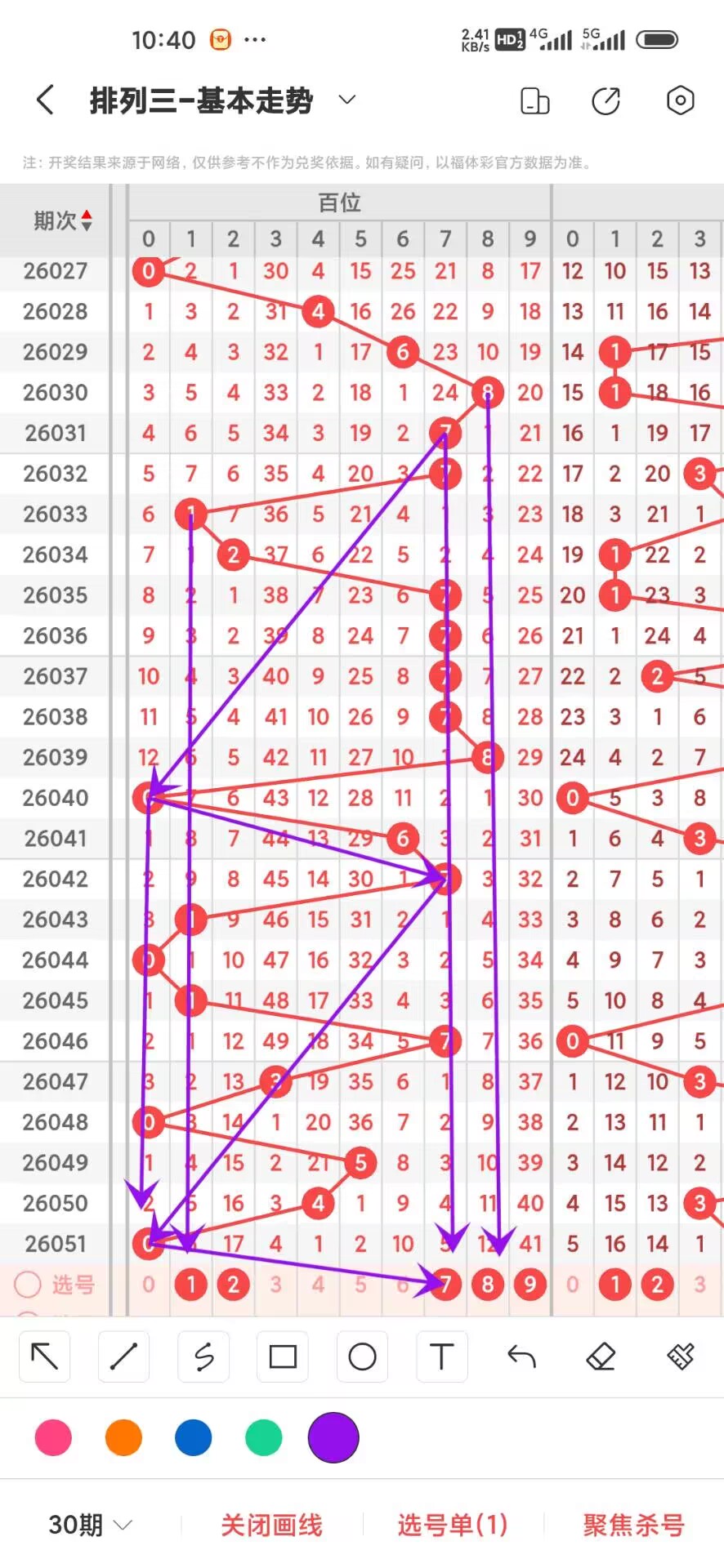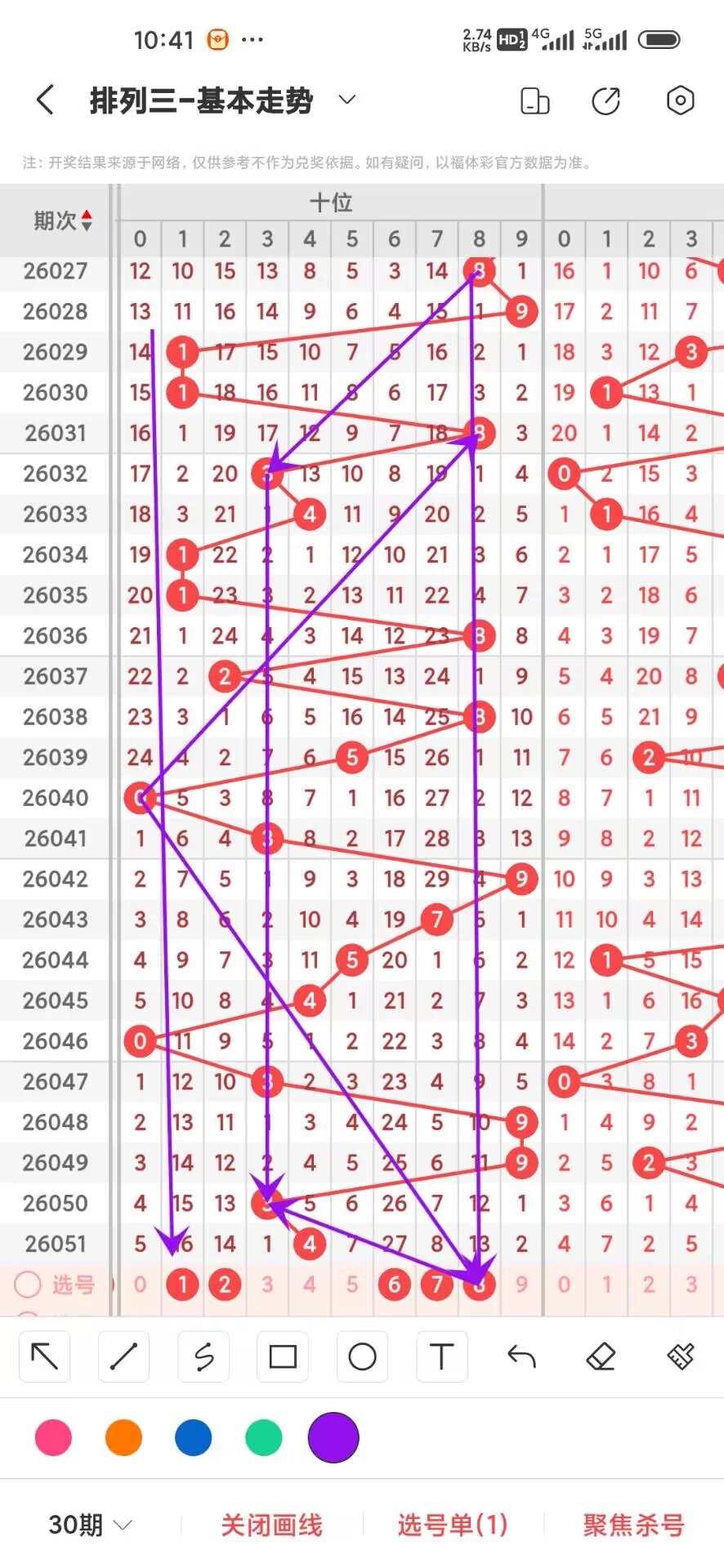 2026052期,上期个位开出奇数5,我们通过走势图来看300期,012路中平均遗漏和最大连出的数据,其中0路平均遗漏总数是41次,0369分别遗漏11,7,12,11次,这几路号码3遗漏最小,我们在来看0路号码的最大连出,0369分别在300期内最高是2连,分别是2,2,2,2,再来看1路号平均遗漏总数26次,147分别遗漏是9,9,8次,在看1路号最大连出3,147分别是2,3,3,再回过头来看2路号平均遗漏总数是28,258分别遗漏是9,9,10次,2路号最高连出是2,258分别是2,2,2,我们再来看个位中目前冷号阶段的号码是68,在热号阶段的是大号,通过上面的分析我们可以做出以下判断,个位今天看14689,防冷号小号回补具体看下面走势图