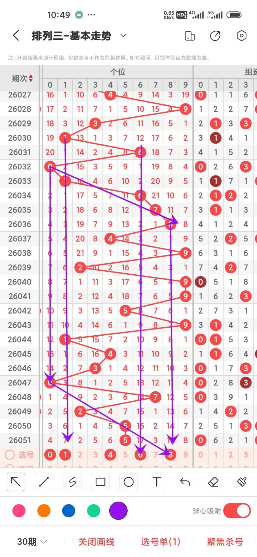 2026052期,上期十位开出偶数4,我们通过走势图来看300期,012路中平均遗漏和最大连出的数据,其中0路平均遗漏总数是46次,0369分别遗漏12,13,13,18次,这几路号码9遗漏最大,我们在来看0路号码的最大连出,0369分别在300期内最高是2连,分别是2,2,2,2,再来看1路号平均遗漏总数25次,147分别遗漏是7,10,8次,在看1路号最大连出2,147分别是2,2,2,再回过头来看2路号平均遗漏总数是27,258分别遗漏是7,11,19次,2路号最高连出是2,258分别是2,2,2,我们再来看十位中目前冷号阶段的号码是1268,在热号阶段的是小号,通过上面的分析我们可以做出以下判断,十位今天看12368,防冷号大号回补具体看下面走势图