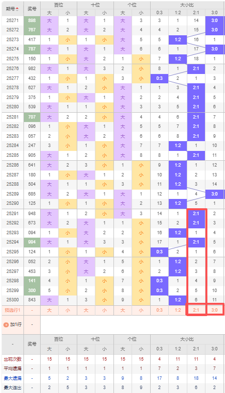 上期大小比:1:2,近10期大小比出现情况:2:1、2:1、1:2、2:1、0:3、1:2、1:2、0:3、0:3、1:2,最近10期出3期2:1,出现4期1:2,出现3期0:3,出现0期3:0,根据近10期出号规律本期推荐遗漏6期的2:1,防遗漏11期的3:0,综上所述大小比推荐:防:3:0,重点关注:2:1。