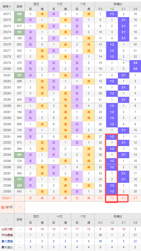 上期奇偶比:1:2,近10期奇偶比出现情况:1:2、2:1、1:2、2:1、1:2、1:2、2:1、2:1、1:2、1:2,最近10期出现4期2:1,出现6期1:2,出现0期0:3,出现0期3:0,根据近10期出号规律本期推荐看好三连出1:2,防遗漏2期出2:1,综上所述奇偶比推荐:防:2:1,重点关注:1:2。