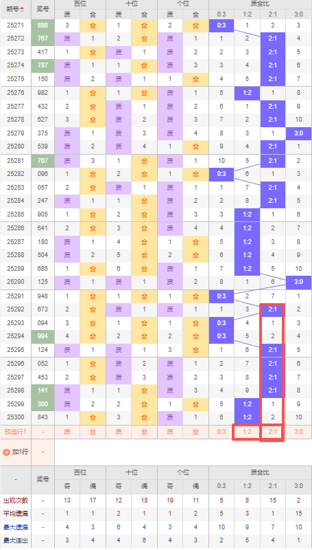 上期质合比:1:2,近10期质合比出现情况:0:3、2:1、0:3、0:3、2:1、2:1、2:1、2:1、1:2、1:2,最近10期出现5期2:1,出现2期1:2,出现3期0:3,出现0期3:0,根据近10期规律本期推荐三连出1:2,防遗漏2期出2:1,综上所述质合比推荐:防:2:1,重点关注:1:2