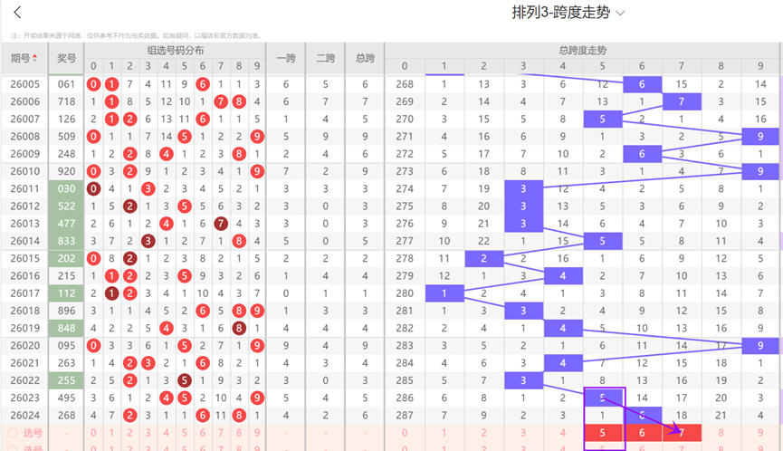 通过观察跨度及跨度属性走势可以发现:近10期内跨度018等号码遗漏值高,出号机会较少,本期跨度大概率仍然不会开出018等号码,因此本期跨度选号时应该考虑018以外的号码,再结合上述走势图看,本期跨度看好567等号码。