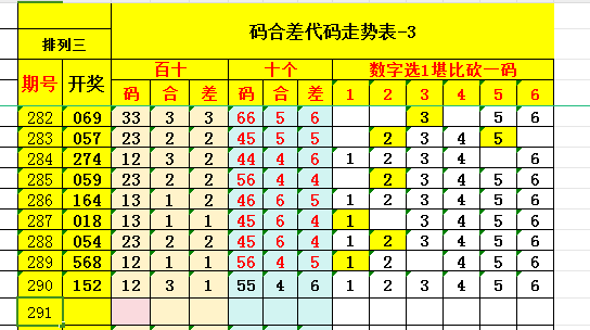 三、本期码合差分析: 组号看合差,巧用合差选号,可提升中奖可能性。码合差定义即:码就是开奖号码;合是指开奖号中三个数字两两相加的和尾、两两相减的绝对值。依据化繁为简原则,侧重分析百十与十个的码合差,同时设定百十位的码合差数字代码123分别代表数字1=147、2=258、3=0369;十个为码合差的数字设定代码456分别代表数字4=147、5=258、6=0369。基于往期开奖数据做走势图表,从多角度展对比号码组合差异,进而筛选高潜力组合。
