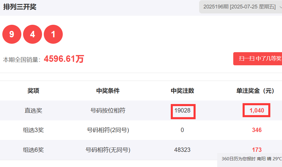 大家好,我是一起彩作者九九锦鲤。今天是2025年7月26日,星期六,是排列三游戏第197期开奖,那么我们首先回顾一下排列196期开奖号码941,我们在文中推出了十位,个位推出了两码,那么百位的话,我上一期只给出了一个5的话,选择的太少了。如果说多选择两个号码,这个9也是能够拿下的,那么首先我们看一下这个开奖结果