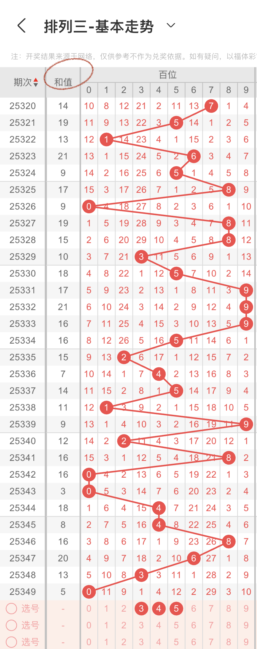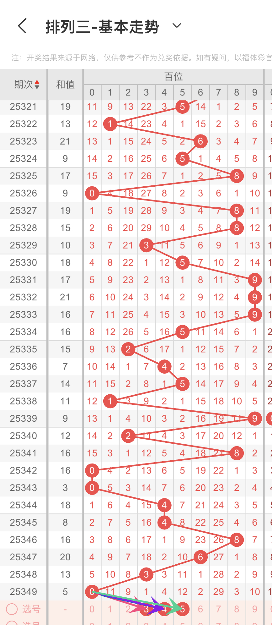 结合上面的大小、奇偶以及012路比,我们可以得到的数据分别是第一组01234,第二组02468,第三组147,我们重点选择3组数据中重复的,那百位我们选择4,防2路的5,0路的3,综上所述百位选345