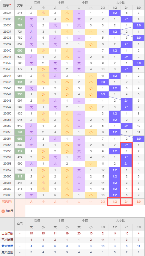 上期大小比:1:2,近10期大小比出现情况:3:0、2:1、1:2、2:1、2:1、1:2、1:2、1:2、1:2、1:2,最近10期出3期2:1,出现6期1:2,出现0期0:3,出现1期3:0,根据近10期出号规律本期推荐六连出1:2,防遗漏5期出2:1,综上所述大小比推荐:防:2:1,重点关注:1:2。