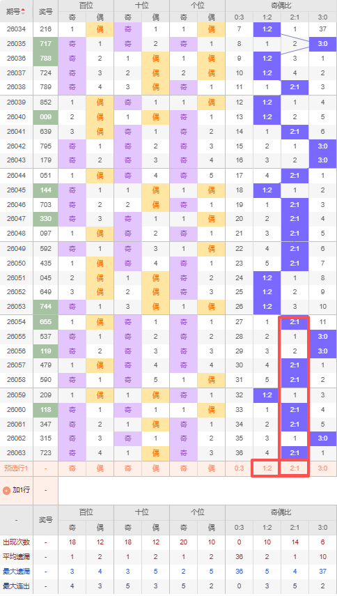 上期奇偶比:2:1,近10期奇偶比出现情况:2:1、3:0、3:0、2:1、2:1、1:2、2:1、2:1、3:0、2:1,最近10期出现6期2:1,出现1期1:2,出现0期0:3,出现3期3:0,根据近10期出号规律本期推荐遗漏4期出1:2,防连出2:1,综上所述奇偶比推荐:防:2:1,重点关注:1:2。