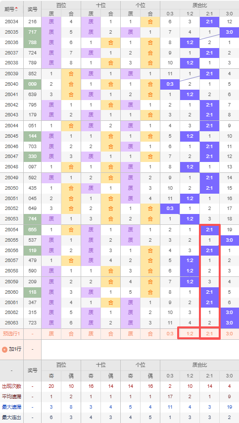 上期质合比:3:0,近10期质合比出现情况:2:1、3:0、2:1、1:2、1:2、1:2、2:1、2:1、3:0、3:0,最近10期出现4期2:1,出现3期1:2,出现0期0:3,出现3期3:0,根据近10期规律本期推荐遗漏2期出2:1,防遗漏4期出1:2,综上所述质合比推荐:防:1:2,重点关注:2:1。