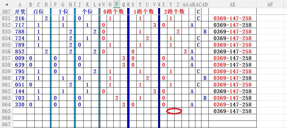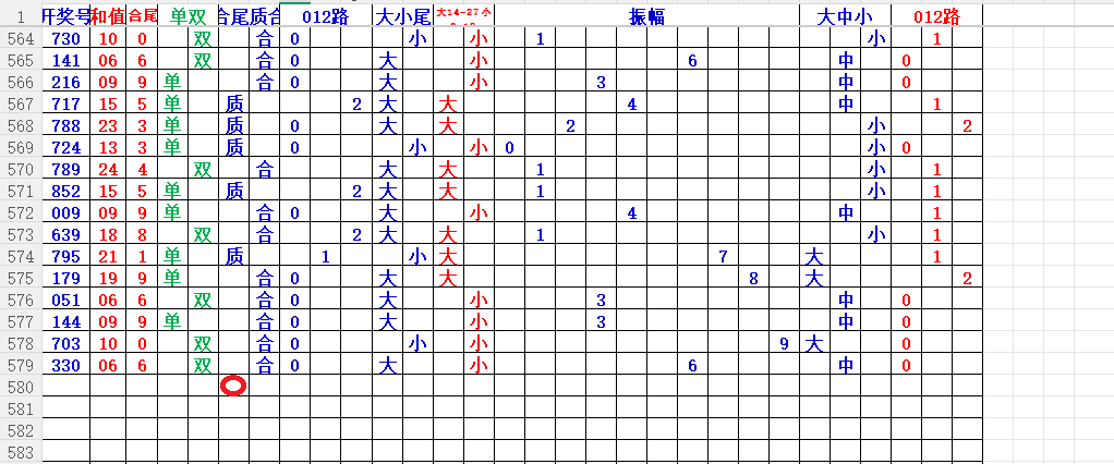 如上图56,012路分析0路出号的概率还是很大,本期可以从0路号入手做胆0369中选;看好369胆码。