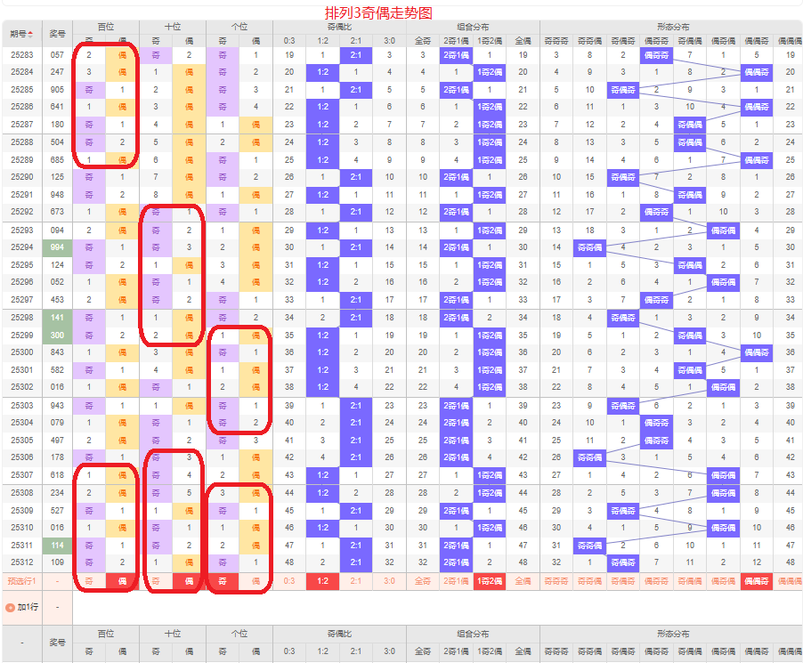 上一期的奇偶比为2:1,两奇的号码组合,从近五期的奇偶数出现情况看,奇数出8次,偶数出现7次,奇数偶数号码出现较平均,本期要侧重两偶的号码组合,侧重偶偶奇或偶奇偶的号码组合,根据奇偶组合形态可做五码定位02468/02468/13579或02468/13579/02468