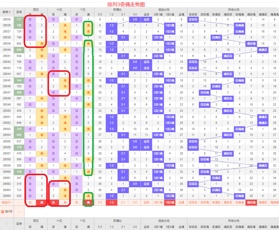 上一期的奇偶比为1:2,两偶的号码组合,从近五期的奇偶数出现情况看,奇数出10次,偶数出现5次,奇数号码出现较多,本期要侧重两偶的号码组合,侧重偶奇偶或偶奇奇的号码组合,根据奇偶组合形态可做五码定位02468/13579/02468或02468/13579/13579