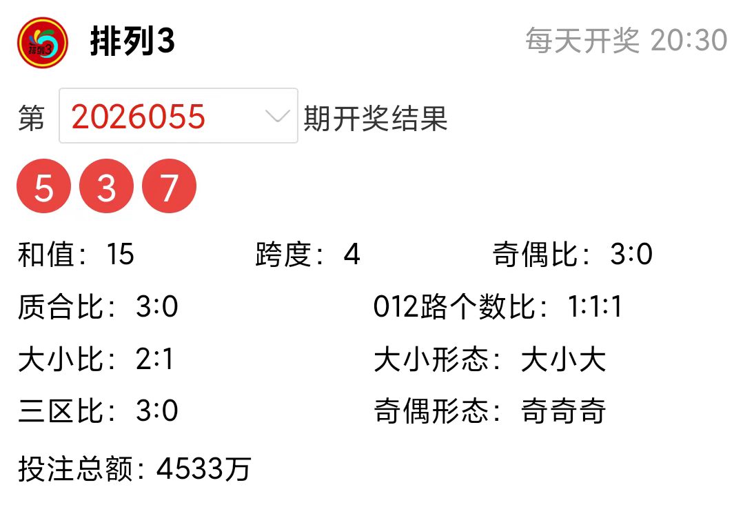 排列3上期(2026055)开奖号码详情