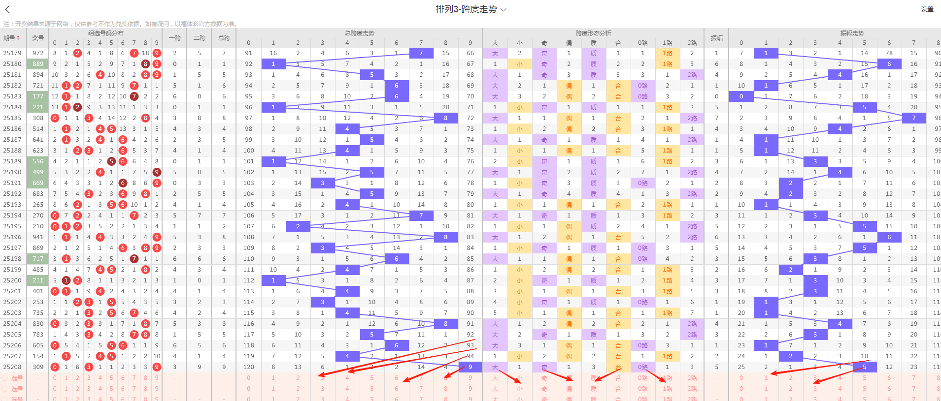 今天体彩排三第2025209期的趋势判断为:方向主看组六防组三;跨度回落选跨度明显;和值回落中区概率较大;