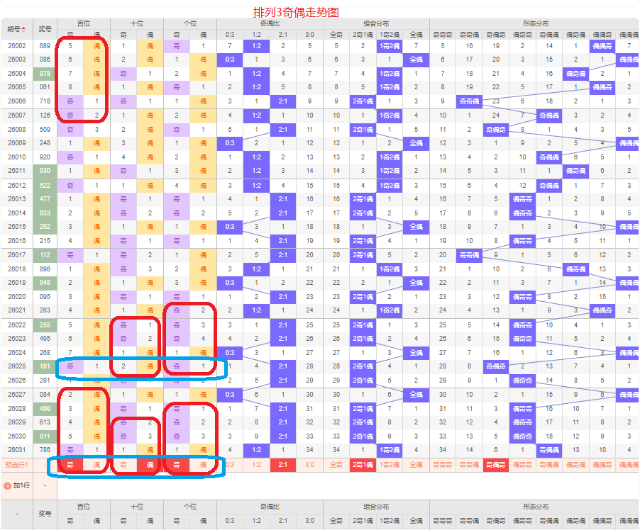 上一期的奇偶比为1:2,两偶的号码组合,从近五期的奇偶数出现情况看,奇数出7次,偶数出现8次,奇数偶数号码出现较平均,本期要侧重两奇的号码组合,侧重奇偶奇或奇偶偶的号码组合,根据奇偶组合形态可做五码定位13579/02468/13579或13579/02468/02468