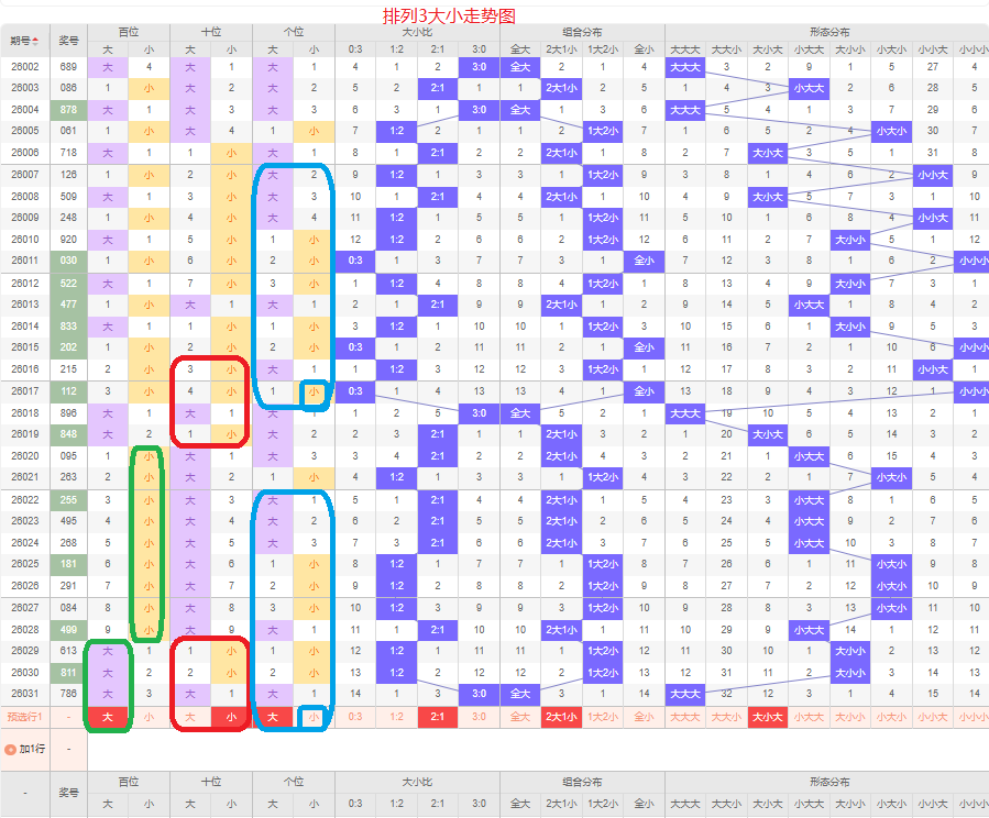 上一期012路个数比为1:1:1,是全路的号码组合,上期没有断路的号码,本期的号码以两路的组六组合号码为主,本期2路的号码可能会出现,本期应该会有0路的号码,本期以02的组六组合号码为主,防12路和01路的组合,侧重02路的号码组合