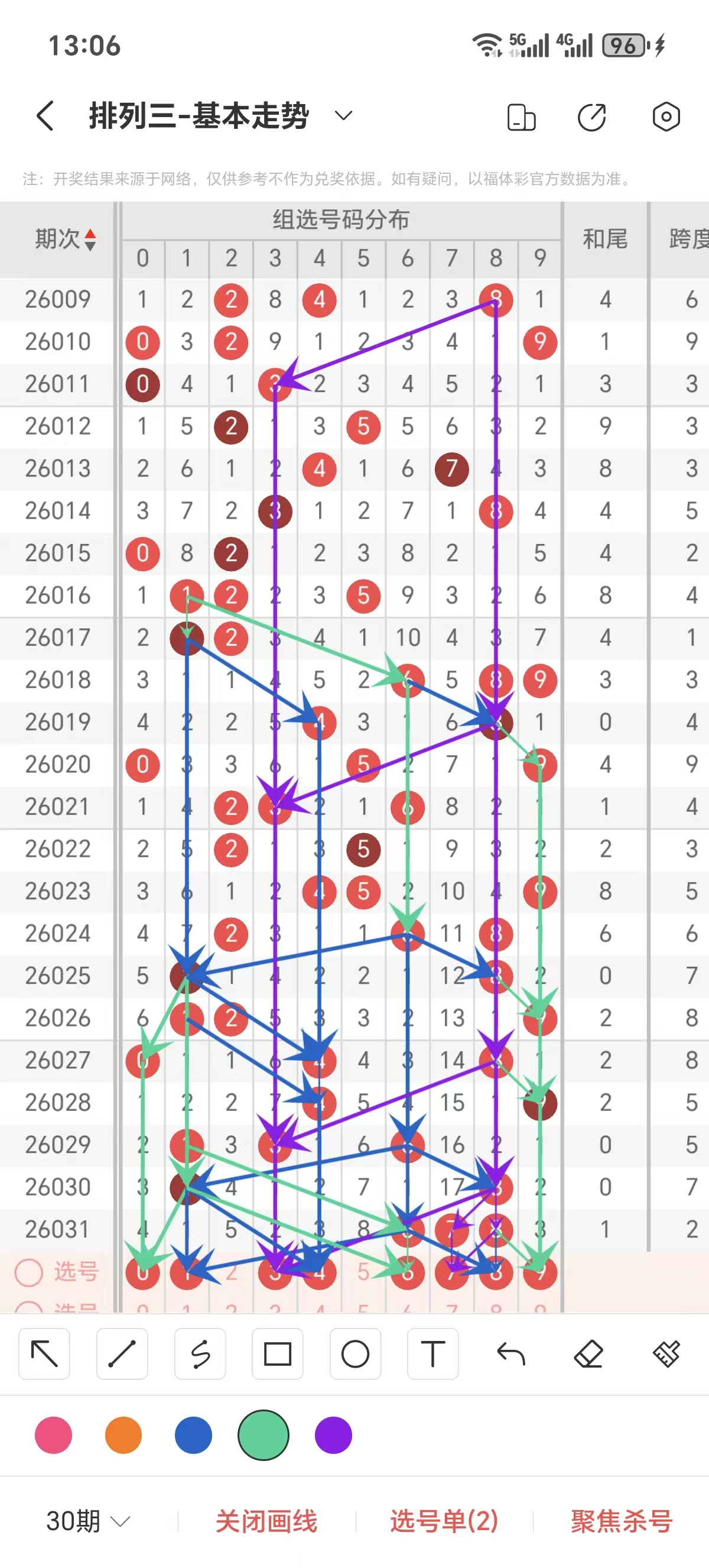 通常情况下在五期之内重复一个跨度的概率较高,近五期重复了5的跨度,近五期跨度为8/5/5/7/2,近期2路的跨度较热,本期要侧重5/6/7跨为主的号码组合。选择好跨度就可以从跨度方面选择相应的双胆码组合,双胆码的选取要根据近期和历史的走势进一步的分析选取。