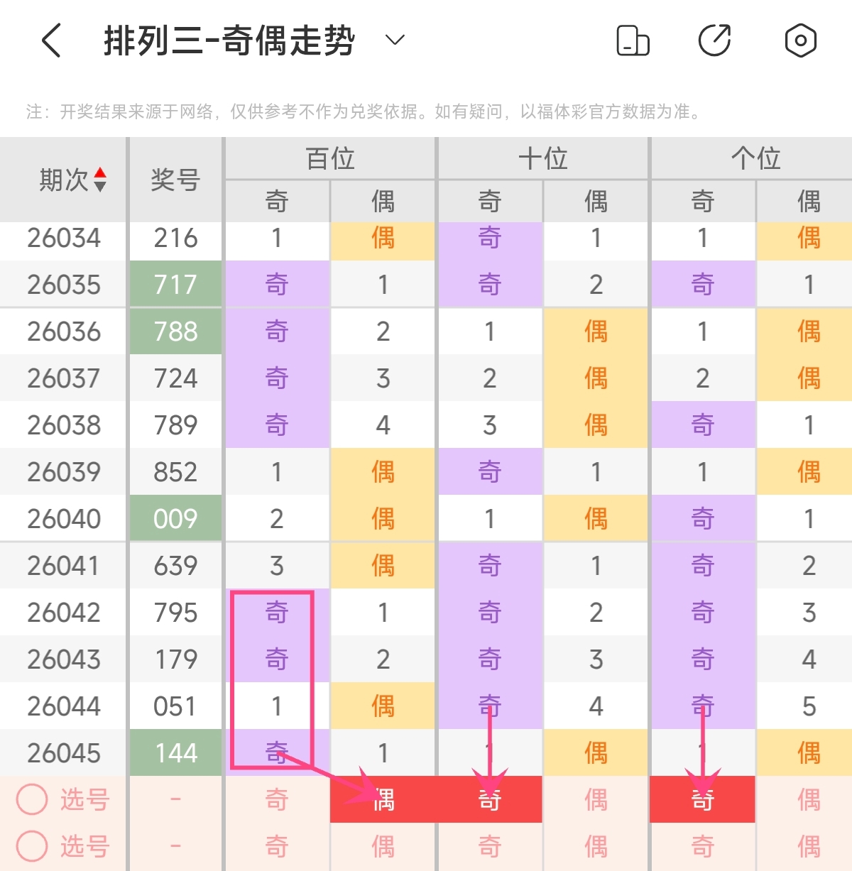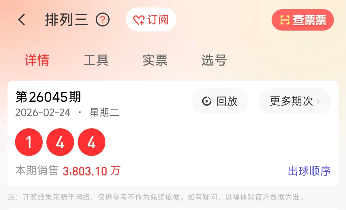 首先让我们回顾一下上期排列三第2026045期开奖号码为144,为组三形态,大小比为0:3,奇偶比为1:2,跨度为3,和值为9。