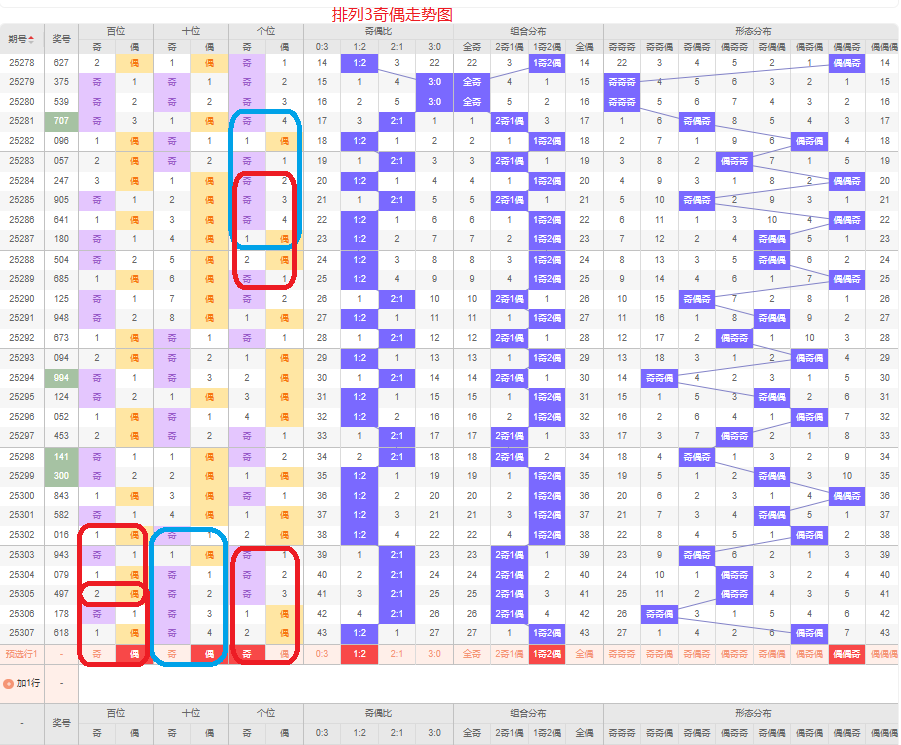 上一期的奇偶比为1:2,两偶的号码组合,从近五期的奇偶数出现情况看,奇数出9次,偶数出现6次,奇数号码出现较多,本期要侧重两偶的号码组合,侧重偶偶奇或奇偶偶的号码组合,根据奇偶组合形态可做五码定位02468/02468/13579或13579/02468/02468