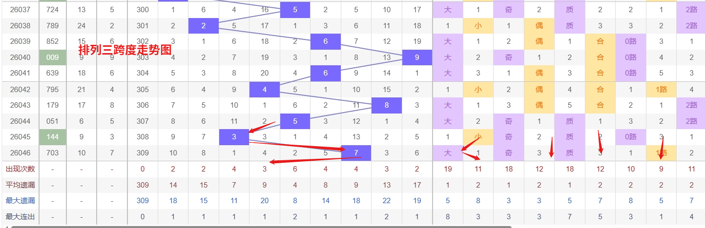排列三 跨度分析:从上图可以看出近100期的跨度大小比约为49比51,跨度奇偶比约为47比53总体来看还是比较均衡的,但跨度大小之间有点差异。我们再从历史开出7跨后下一期2跨度数据来做参考。最近10期跨度大小比约为5:5期开出小数跨度过多返回大数跨度的概率更高一点。历史开奖近2期出7跨以后的走势为327期开出7跨后下一期走6跨走出1振幅,第335期开出7跨后下一期走2跨走5振幅第009期开出7跨后下一期开出9跨走出2振幅。连续多期大振幅,排列三跨度走势呈现明显的冷热分化格局,其中2跨作为当前较为突出的冷号,其遗漏期数已远超理论均值,形成了较为罕见的深冷形态,从历史出号规律来看,任何冷号在经过长期压抑后都会迎来技术性的回补需求,因此2跨在近期开出的概率正在持续累积,具备较强的反弹预期,值得重点关注其冷后回补的时机;与此同时,5跨则展现出截然不同的热度特征,作为近期频繁亮相的热门跨度,其出号节奏明显加快,且往往呈现出连续或间隔短周期重复出现的惯性走势,跨度走出1到5个振幅看好的跨度有2569跨,所以第2026047期排列三跨度推荐2569跨。