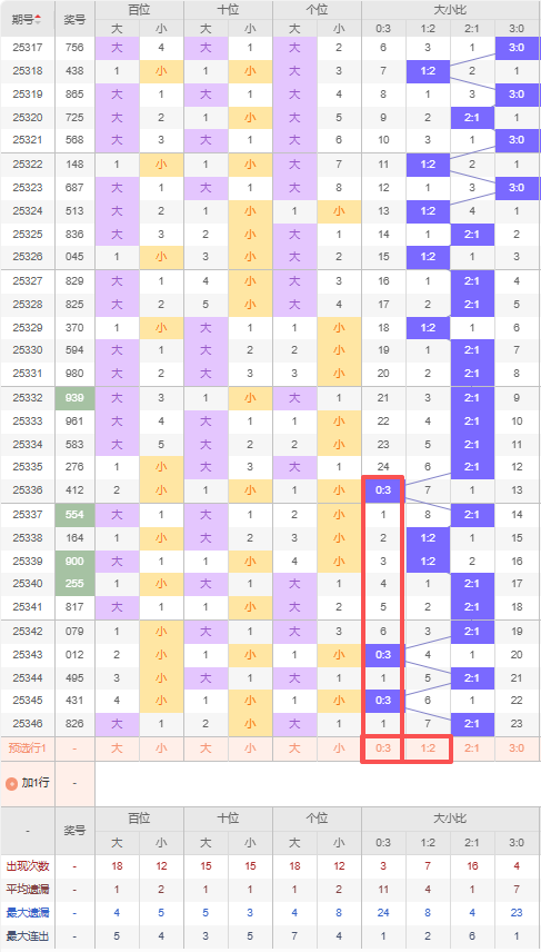 上期大小比:2:1,近10期大小比出现情况:2:1、1:2、1:2、2:1、2:1、2:1、0:3、2:1、0:3、2:1,最近10期出6期2:1,出现2期1:2,出现2期0:3,出现0期3:0,根据近10期出号规律本期推荐隔期出0:3,防遗漏7期出1:2,综上所述大小比推荐:防:1:2,重点关注:0:3。