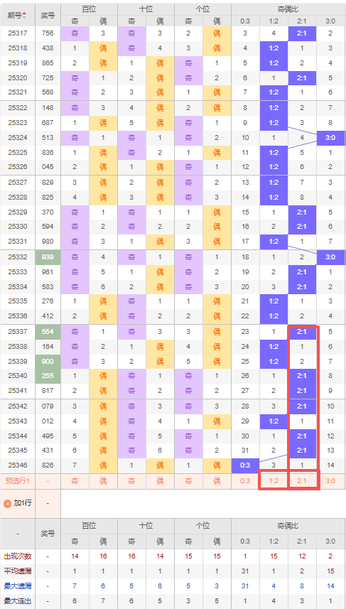 上期奇偶比:0:3,近10期奇偶比出现情况:2:1、1:2、1:2、2:1、2:1、2:1、1:2、2:1、2:1、0:3,最近10期出现6期2:1,出现3期1:2,出现1期0:3,出现0期3:0,根据近10期出号规律本期推荐隔期出1:2,防隔期出2:1,综上所述奇偶比推荐:防:2:1,重点关注:1:2。